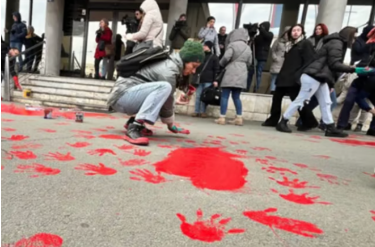 The vote was the start of a massive wave of protests in major cities, where protestors would spill red paint on the streets and dye their hands red while chanting “Ruke su vam krvave”, which effectively translates to “You have blood on your hands”, referring to the government. Since December 2nd, one after the other, almost every single University in Serbia joined the blockades (more than 85 faculties), followed by a majority of high schools (Gruhonjic). The students would occupy their universities until June 2025, closing the doors to the media and public, requiring a valid student ID to enter. There would always be someone at the university, guarding the building, with classrooms accommodated as sleeping rooms. Proud citizens and parents didn’t hesitate for a second to show their support for the students by bringing them donations and standing by them, as they would block traffic every Friday in multiple locations at exactly 11:52 for the fifteen minutes of silence for the victims (“Srbijo, pomozi studentima”). It is important to note that all the protests organised by students were of a peaceful and nonviolent nature.