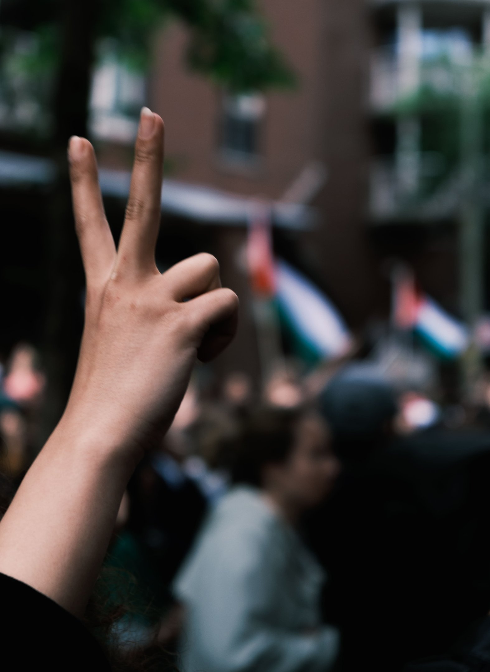 Upon arriving, I quickly adjusted my settings and shot everything that caught my eye. Onlookers from distant balconies, police officers in riot gear, and masked students. My small camera allowed me to get close to the action without arousing suspicion; several press photographers took the eyes of students and police away from my lens. Briefly. For at one pivotal moment, I noticed an officer removing his riot helmet and started pressing my shutter constantly. Slowly I began to see his face appear in my viewfinder and then, as if I was seeing a mirage, the officer turned his head to face me. Locking eyes with my lens. What followed was the same action from all of his colleagues. One by one, they took off their protective gear in front of a crowd of entirely unarmed students. Cheers and communal exclaims filled the air yet again. Students simultaneously show the peace gesture.